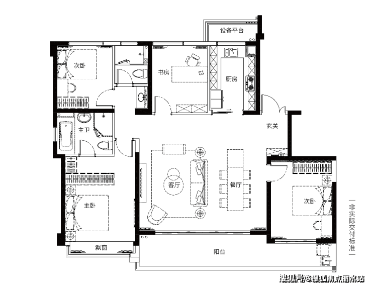 3+1房两厅两卫户型,四叶草户型布局,空间浪费少,设有玄关。