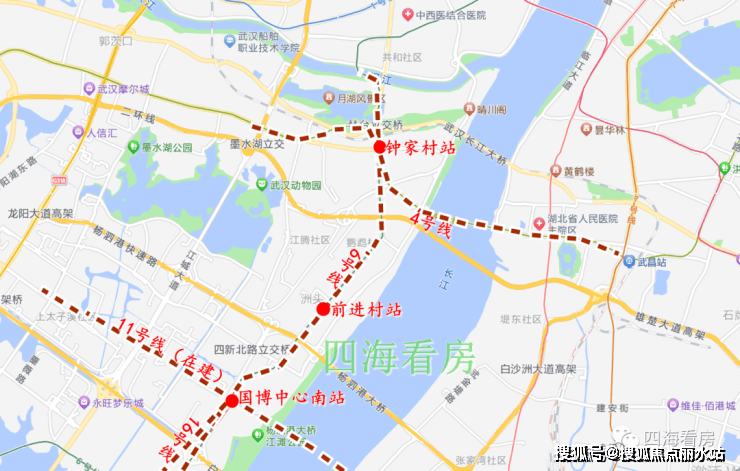 同时,6号线约3站路可以与4号线换乘,4号线可直达武昌人民医院、武昌火车站、楚河汉街,2站路可在国博中心南站与16号线和在建的11号线换乘,其中11号线又直达光谷核心以及光谷东。
