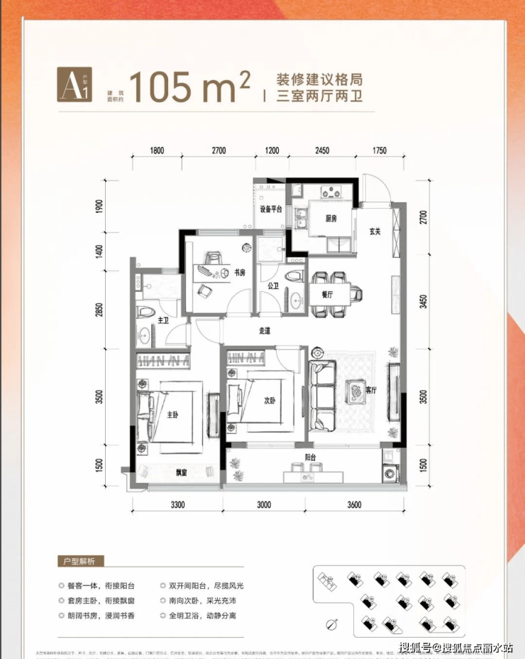一、建面约105方三房两厅两卫: