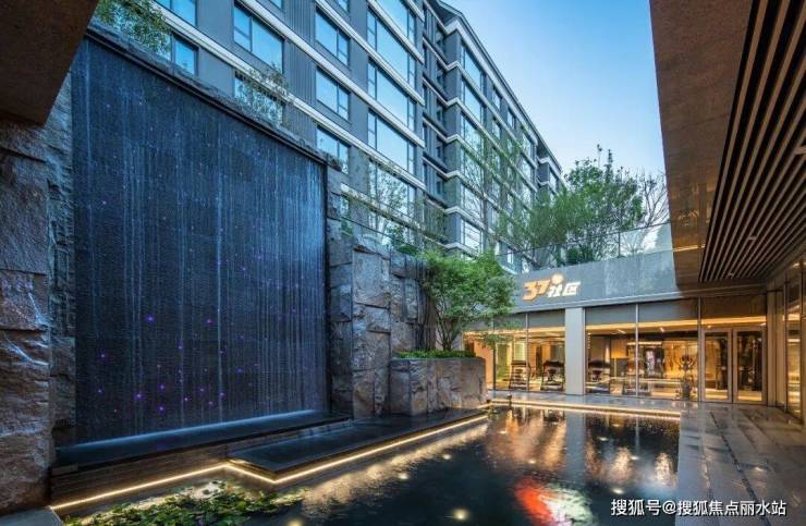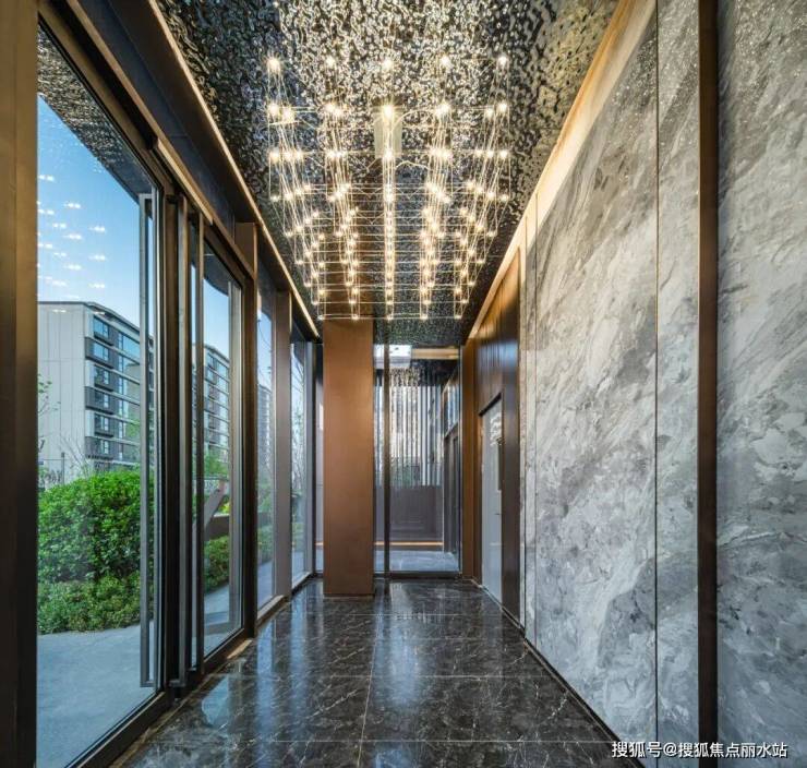 尤其首层大堂顶部为水波纹不锈钢,并且前厅区域将建筑门头幕墙材质引入室内空间,使整个归家大堂与外檐效果相呼应,将归家仪式感拉满。