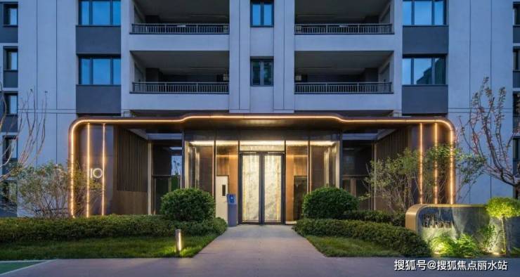 单元门头采用金属曲面铝板及超白玻璃幕墙材质,搭配发光字标识及嵌入式可视对讲,充满现代感。
