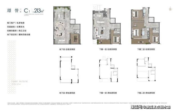 叠墅下叠建面约213㎡,私享电梯,自带花园庭院+地下室,可打造私人宴会厅、家庭影音室、私人酒窖等空间。
