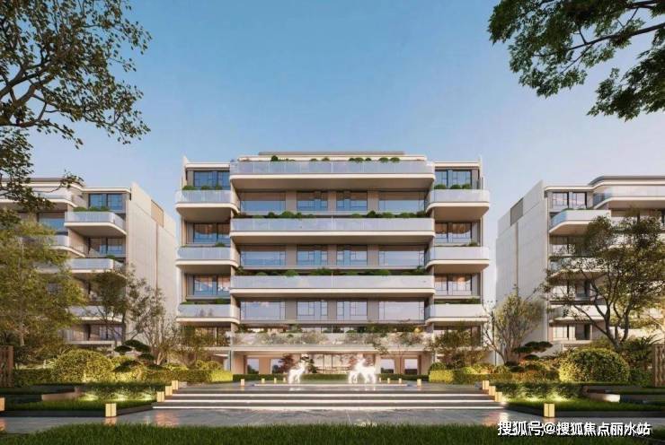 洋房外立面采用铝板+玻璃栏板材质,搭配灰金色调曲线,尽显奢华,更有垂直立体式花园,奇偶错层挑高庭院,可打造私密专属天地。