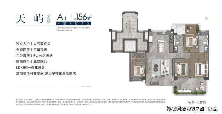 产品方面,四代洋房A1户型建面约156㎡,4房2厅2卫,四开间朝南,LDKB一体化设计,全能四房拥有通透采光,南露台+北阳台可打造多元化活动空间。