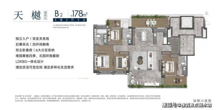 洋房B2户型建面约178㎡,4房2厅3卫,四开间朝南,拥有巨幕采光,南园展卷四季,北园环抱餐厨。