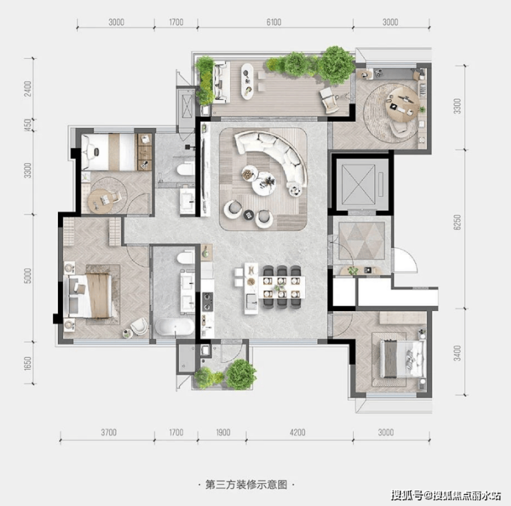 针对于花园场景,在空间上做了跨越式突破约6m挑高*约6.1m面宽*约2.4m进深空间,颠覆市场传统挑高格局与进深体验,拉伸空间纵向尺度,不仅赋予室内空间绝佳的采光、开阔的视野,更以极阔舒朗的空间体验,营造人居多场景呈现。