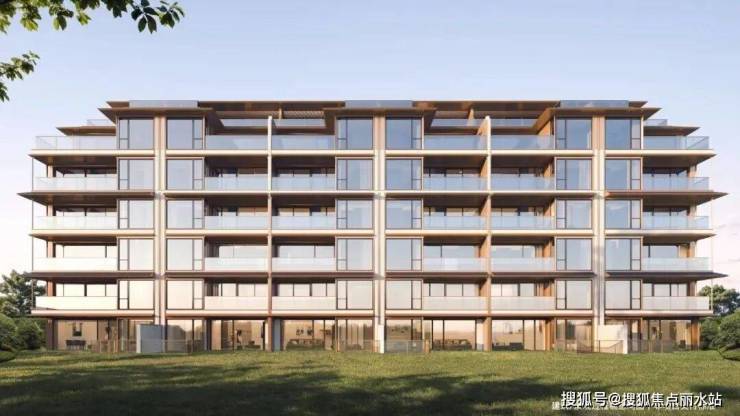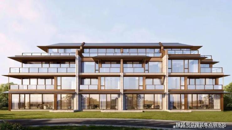 建筑立面,整体延续鸣湖里的设计语言,以大面low-E玻璃、香槟金铝板、暖白色石材搭配灰色金属铝板线条勾勒,更融入时尚元素,打造出潮奢宋韵纯低密住区。