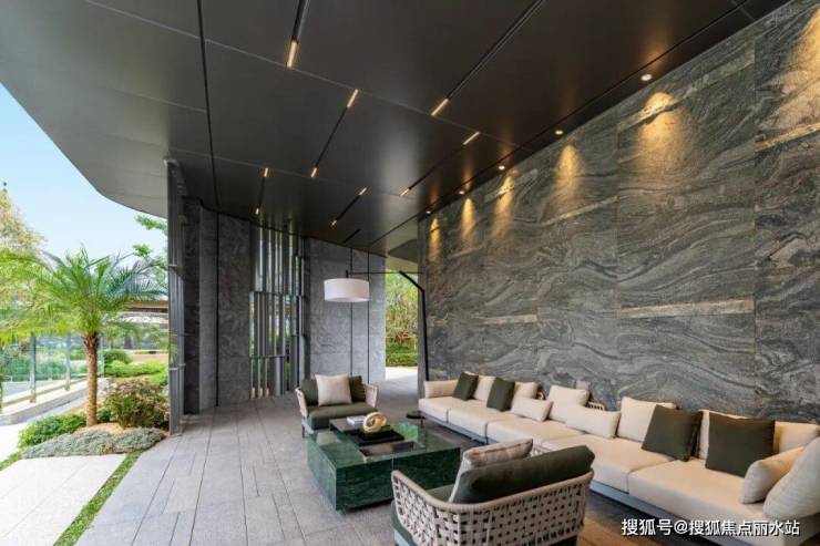 近期公开的B地块「浮光悦境」,以“漂浮绿洲”为设计灵感,通过悬挑错层的水景、热带植物组合,库班绿石材的精心点缀,打造无锡首个“斐济风情”下沉式浮岛会所。