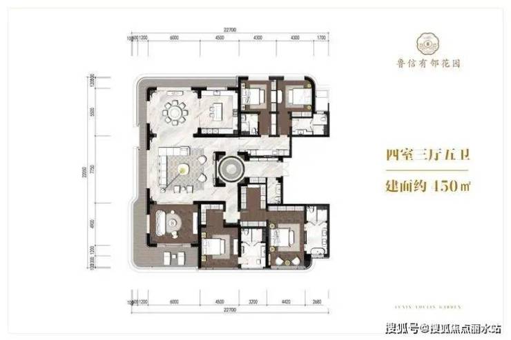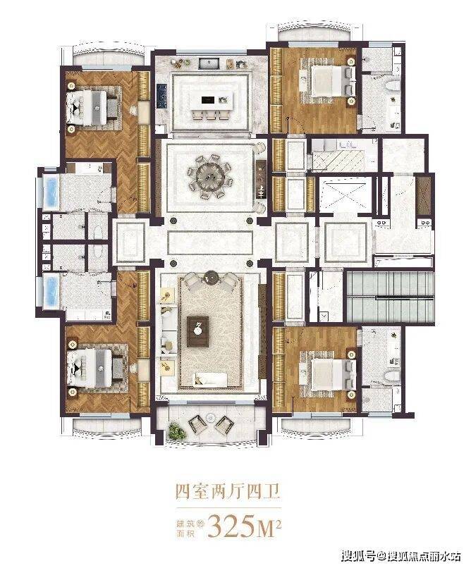 项目主力户型为325㎡四房两厅四卫,公摊仅约15%,超高得房率。