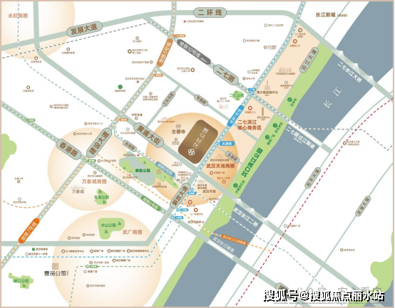 项目位于江岸区汉口滨江商务区板块,距离内环线约300米,距离二环线约1.6公里,属于内环,真正的核心地段。