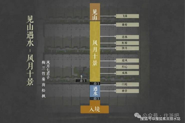 中国人自古讲究归家礼序,门第之尊;久映颂月将传统中式建筑的礼序空间融入整体的规划布局中,形成一坊八巷-置坊入巷-穿巷入户的三重归家礼序。