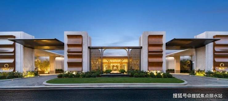 以超90米面宽的庄园式鎏金大门奠定归家气度,搭配四座约7.5米对称布局的高艺术景墙与两侧弧形拱廊,仪式感与尊崇感十足。