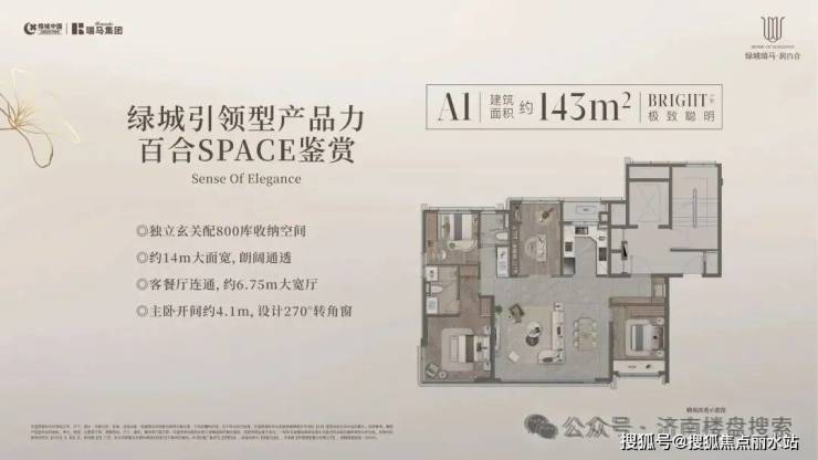 143㎡三/四室:独立玄关+800库收纳空间;约14米面宽;客餐厅连通,约6.75大宽厅;主卧开间约4.1米,带270度拐角落地窗。