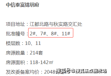 近日,扬州东北区中信泰富锦玥府新拿工程幢号11#、8#、7#、2#楼现房销许,共214套房源,户型建筑面积约118-142㎡,发改委备案均价20489元/㎡。