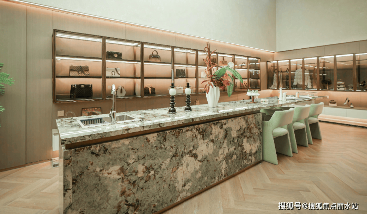 女士主题空间,则是专属的休闲角落。 陈列柜展示着心爱的饰品和新款箱包,每处细节都透露着女主人的审美品位。落座区挑高设计,作为主人的私人会客厅,尽显奢华阔绰。