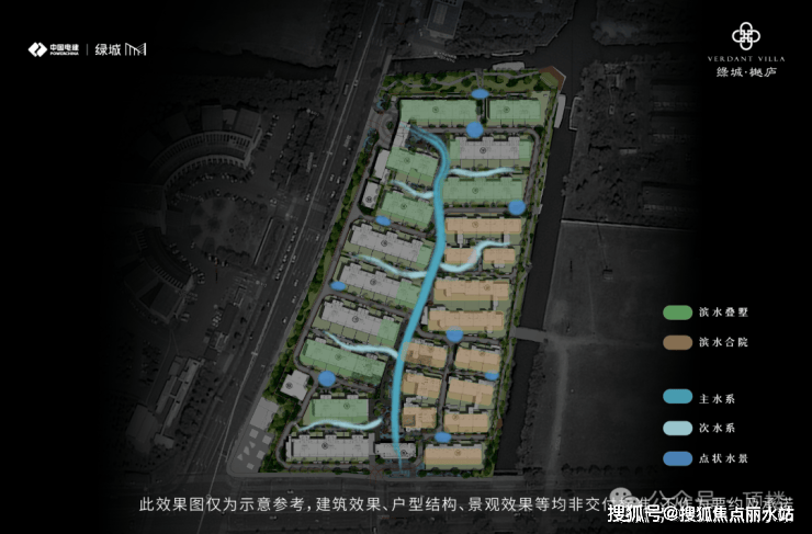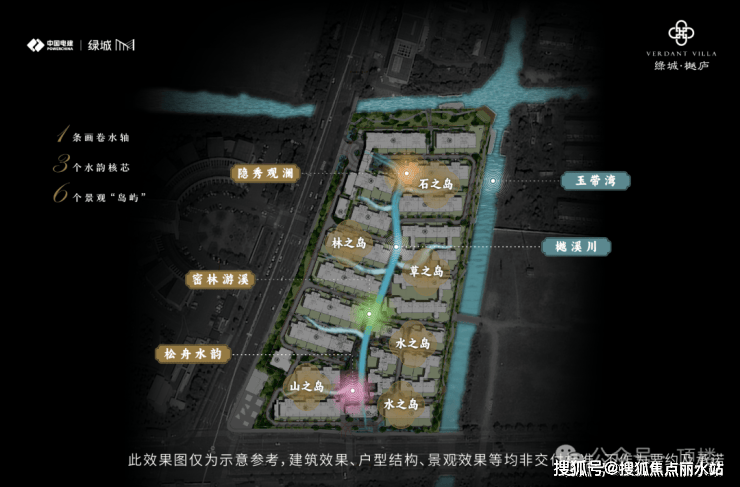 绿城·樾庐外部打造约500米长水岸绿带「玉带湾」,呈现可漫步、可停驻、可社交的诗意栖居场域。内部以一条水轴「樾溪川」构筑当代园林系统,并划分两大业态组团,同时以支脉水系分割,形成岛屿化组团,在水境空间中勾勒流动的静谧体验。