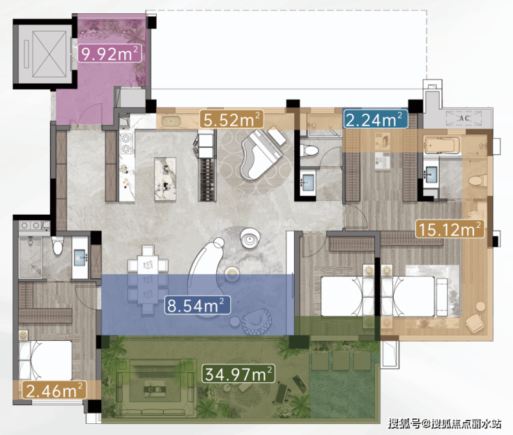观萃143平方米户型营造了270°IMAX环幕视野,搭配空中浮岛阳台、双套房设计,赠送率达55%,最终实得面积高达约196平方米。