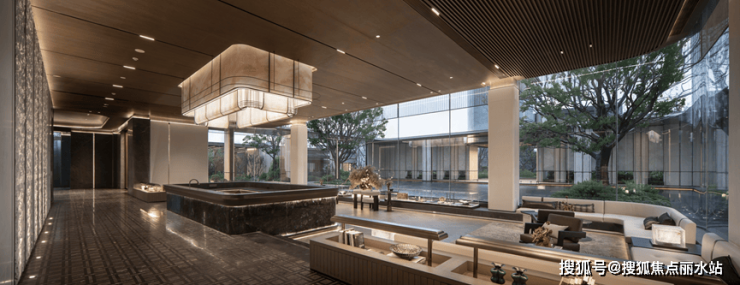 中庭约1140平方米的下沉式水景景观,不吝成本地运用了大量石板、金属饰板,在暖色灯光的照拂下,将极具尊崇感的归家之旅徐徐展开。