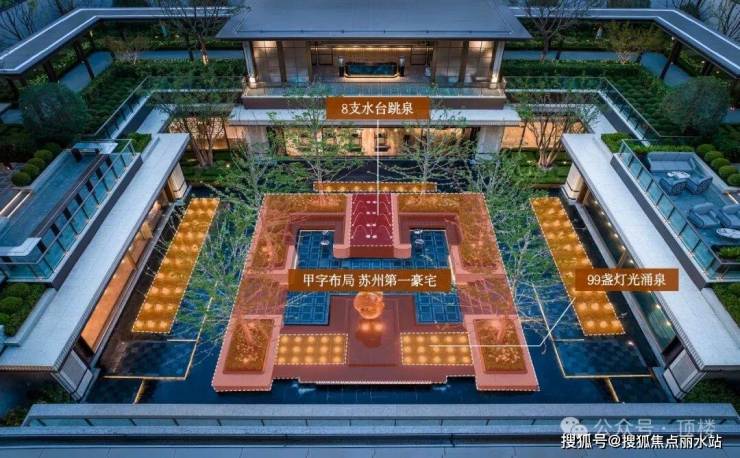 酒店式5大景观空间布局:酒店式入口(车马院)、酒店式礼序水院(音泉光厅)约25米的蓝翡翠奢石水景, 取鉴西班牙阿尔罕布拉宫仪式水轴,意大利托斯卡纳夹景设计手法、720㎡下沉式庭院—浮岛花园,奢石打造的的8支水台跳泉,配合99盏灯光涌泉,借鉴了意大利法尔奈斯庄园设计,且形成巧妙的“甲”字布局, 寓意苏州第一。酒店式风雨连廊(光影花厅)、蒙特梭利儿童乐园.十大趣味主题, 自然式的高知育教场景