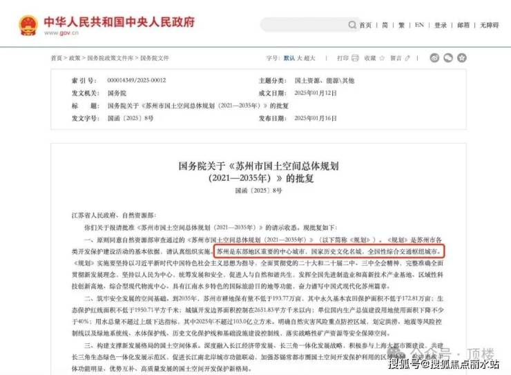 2025年1月12日,国务院批复了《苏州市国土空间总体规划(2021-2035年)》,这是苏州历史上第一部“多规合一”的国土空间总体规划。 国务院批复明确苏州是东部地区重要的中心城市,国家历史文化名城,全国性综合交通枢纽城市。