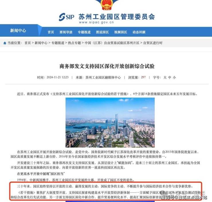 2024年11月,商务部发布《支持苏州工业园区深化开放创新综合试验的若干措施》。其中提到了支持苏州工业园区根据发展需要和国土空间规划适时扩区;高标准规划建设桑田科学岛、建设一批海外离岸创新中心;推动苏淀沪城际铁路接入虹桥综合交通枢纽与上海机场联络线贯通运营……通过科技创新、高新产业、城建规划等,全方位力挺苏州工业园区,力争5年内,建成开放创新的世界一流高科技园区。
