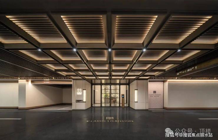 经典车库门头:沿用半岛酒店经典的格纹鎏金吊顶,提升归家礼序和尊贵感