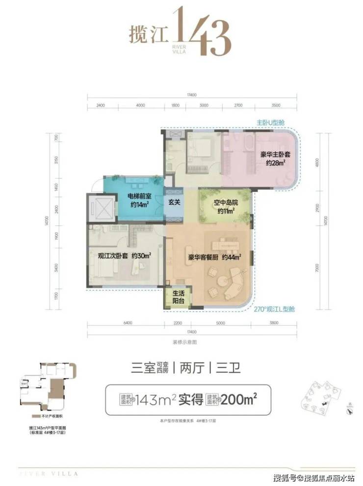 约143㎡户型,实得面积约200㎡,给业主「墅级大平层」的居住体感,住感相当于是200㎡大平层,而且与200㎡顶豪产品对比,它在尺度和使用舒适度上都双双碾压。