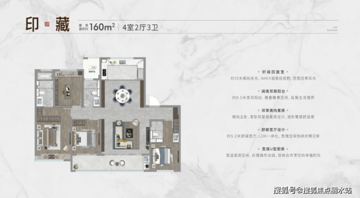 建面约160㎡,4房2厅3卫, 同样是四开间朝南设计,大横厅设计,尺度感满满,南北通透。