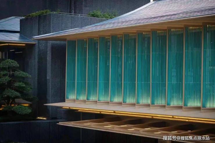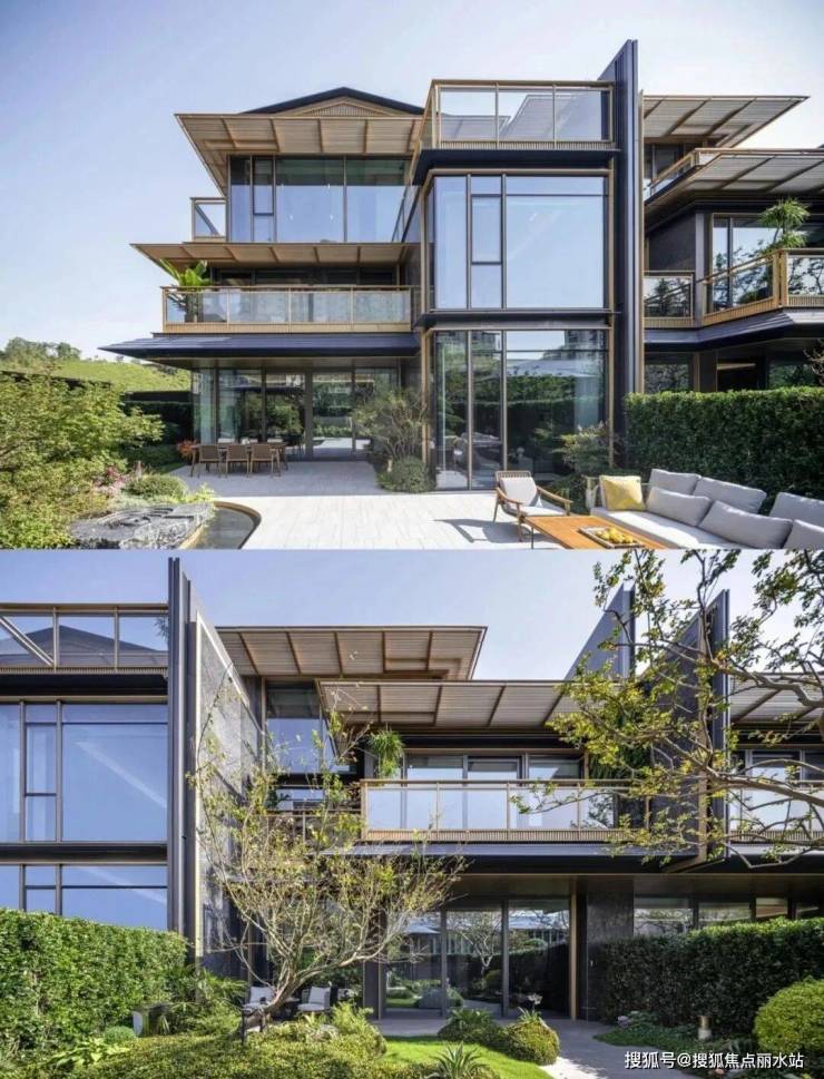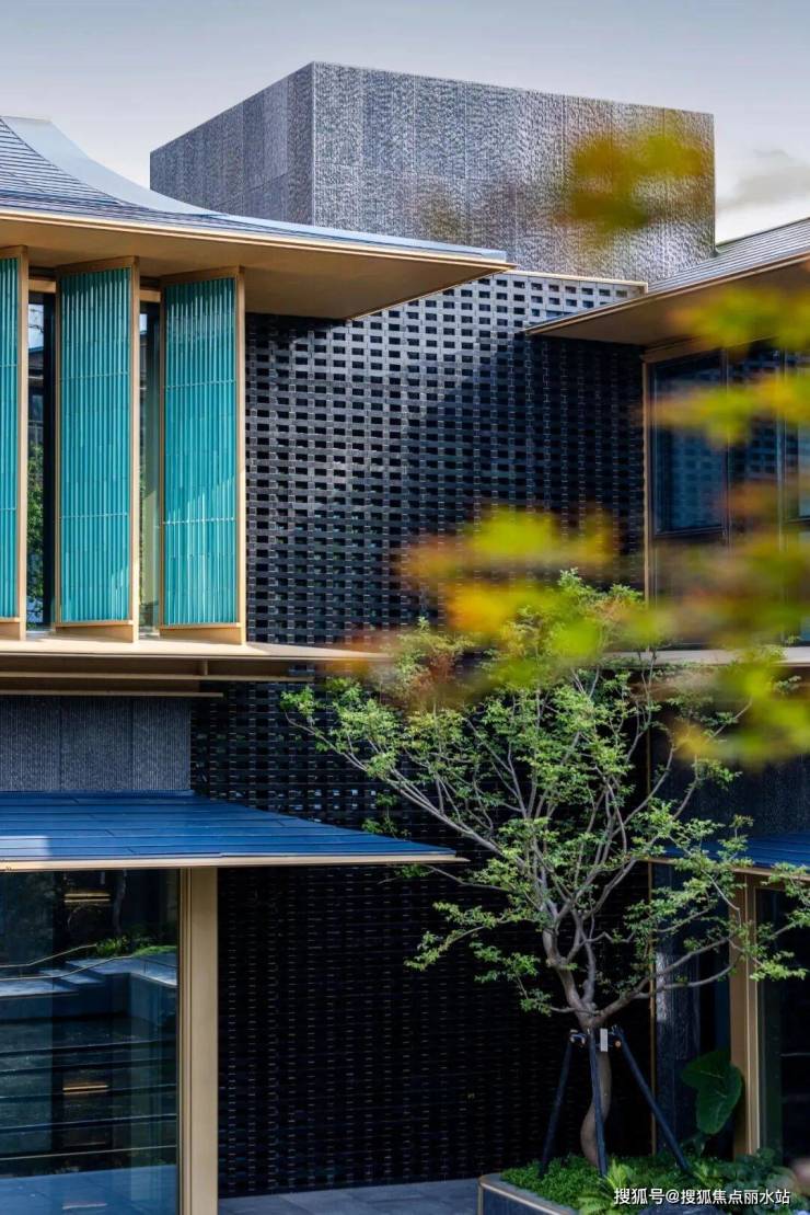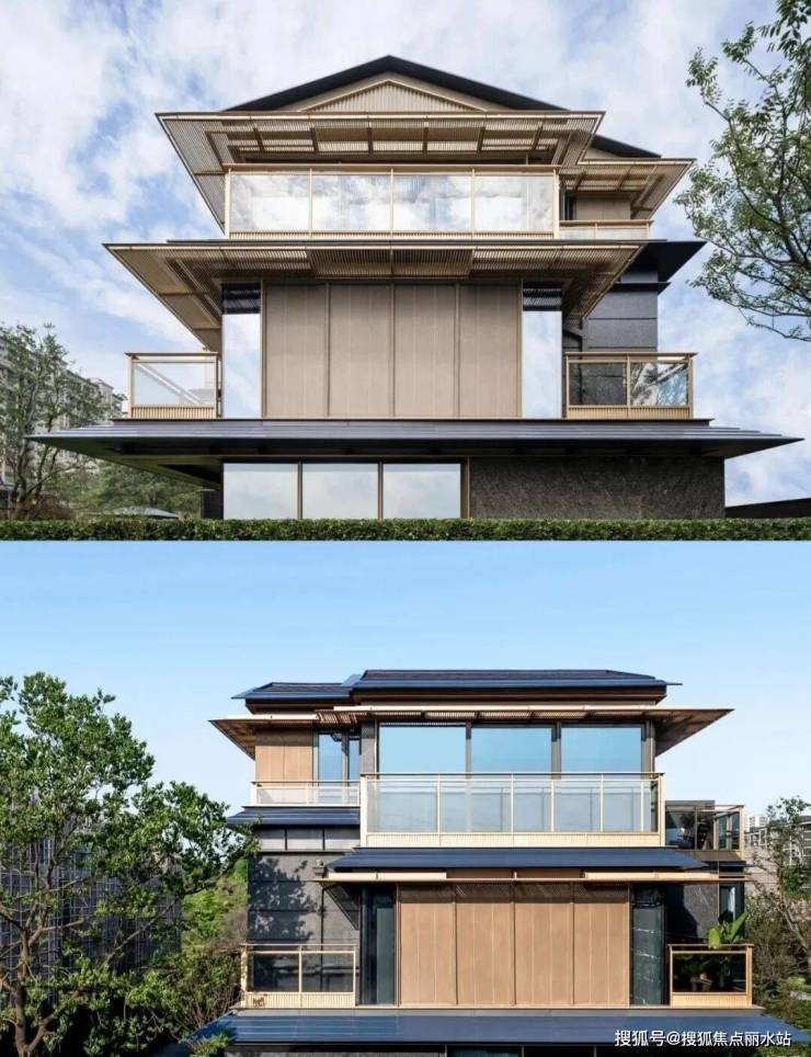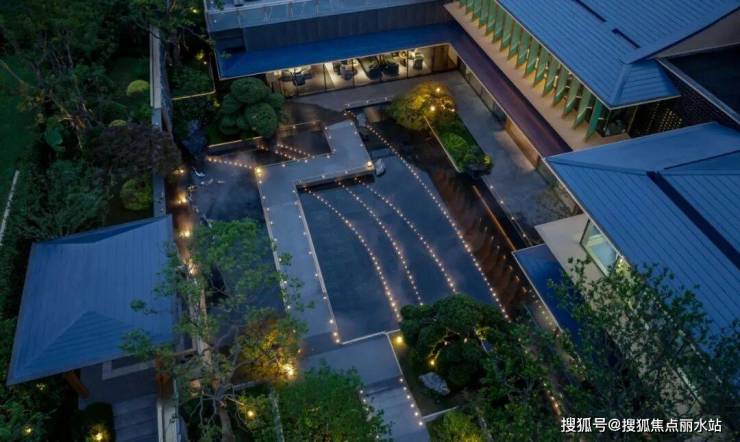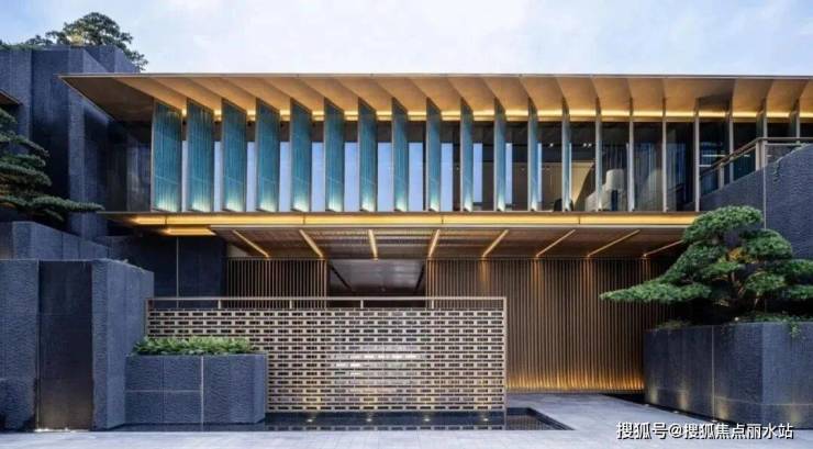 在立面打造上,提取“宋画”中的线条感,提取歇山顶样式,转译形成深远的挑檐,在视觉效果上给人以棱角分明、结构清晰之感,整体呈现一种清雅内敛的当代气质,大尺度巨幕玻璃窗镶嵌金色铝线条,如画框一般,攫住窗外的每一寸风景,让建筑隐于自然