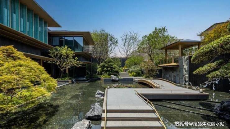 主入口灵感源自《溪山行旅图》,山水与楼阁结合地形做抬升,山水松阁、飞石流瀑,用层叠的黑金砂石做出宋画中的山体