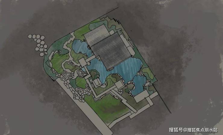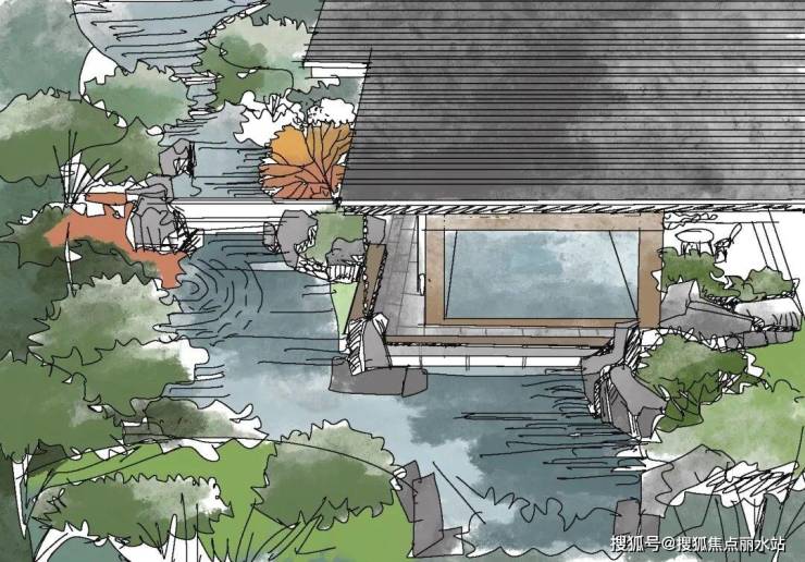 拾级而上,穿过林院秘境,进入茶室前庭,是一处安静的院落,拙朴的踏步石,流水石,飘逸的红枫,婀娜富有张力的乌桕,自然的地形。