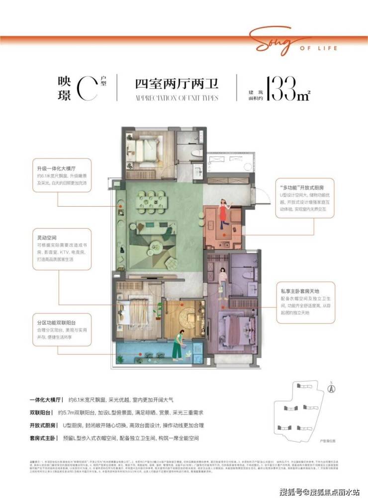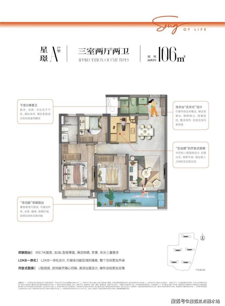 约106㎡户型点评:双联阳台约6.7米面宽,加设L型俯景面,满足晾晒、赏景、采光三重需求,LDKB一体化设计,打破各功能区域的隔离,整个空间更加开阔,开放式厨房 U型厨房,封闭敞开随心切换,高效台面设计,操作动线更加合理。