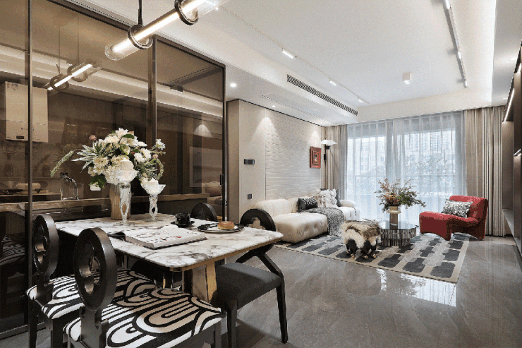 建面约133㎡户型,则可以匹配置业者的高品质改善需求。三面采光的优势,让整个室内空间更加通透、明亮,也方便将餐客连厅布置于户型的侧边。结合约6.1m的景观飘窗及大面玻璃窗,将整个餐客区的气质和格调直接拉满。