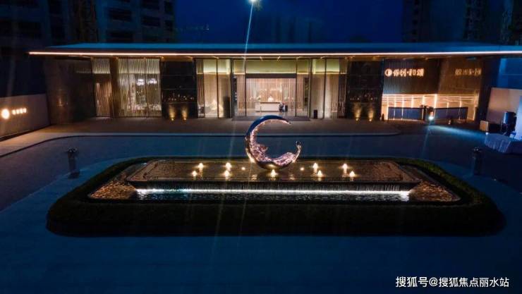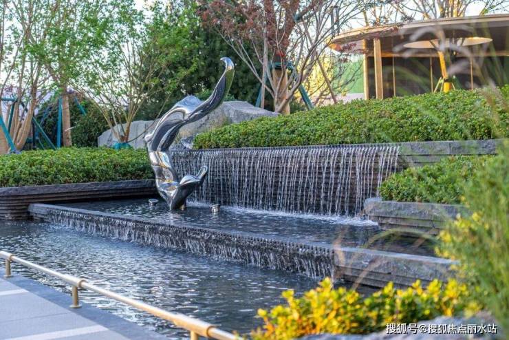 小区入口处就启动了硬质水景,前广场月牙状雕塑叠加水系开启归家之旅。