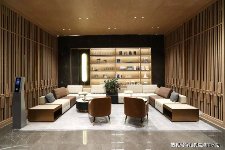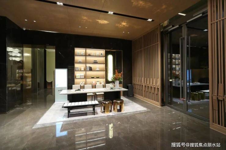 入户大堂也保持了酒店式的高级感,两侧矮墙刻有海水江崖纹,搭配几何线条的装饰,结合灯光营造了品质氛围。