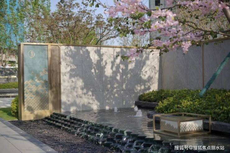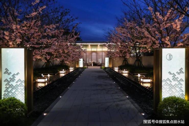 真正的核心景观是从中轴迎宾水景开启,黑金沙石为基底加之916块进口意大利普拉达绿大理石纯手工拼接,自带镜面效果,倒影两侧树龄超过10年以上的日本染井吉野樱花,水墨意境款款而成。
