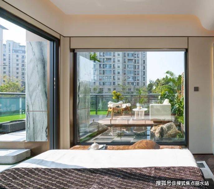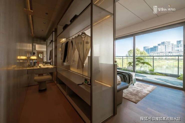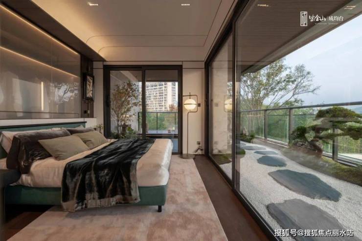 在主卧户型上,设计以双面开窗270°瞰景,全面屏落地窗+超广角视野,比肩星级酒店总统套房。