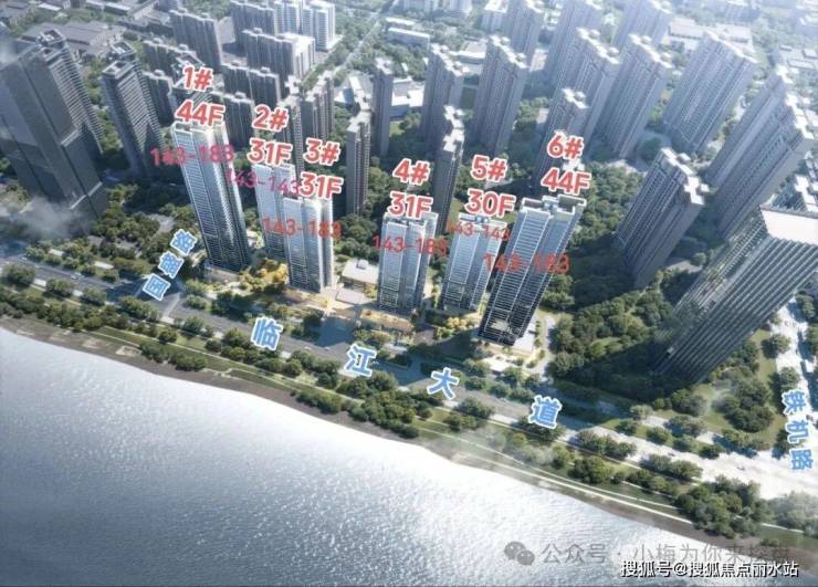 该项目规划有6栋楼,临江一字型排开,全部一线临江,每栋住宅都有不错的观江面。栋栋正观江,前排无遮挡。其中2栋超高层、4栋高层,整体规划定位为改善。项目总建面约8.97万方,项目容积率2.49,总户数约402户,住宅机动车停车位约431个。该项目的人行主入口就在临江大道沿线,在3、4号楼中间,还规划了下沉庭院,而且每栋楼之间有风雨连廊连接,规划有绿化架空层和5个景观小组团组合而成。