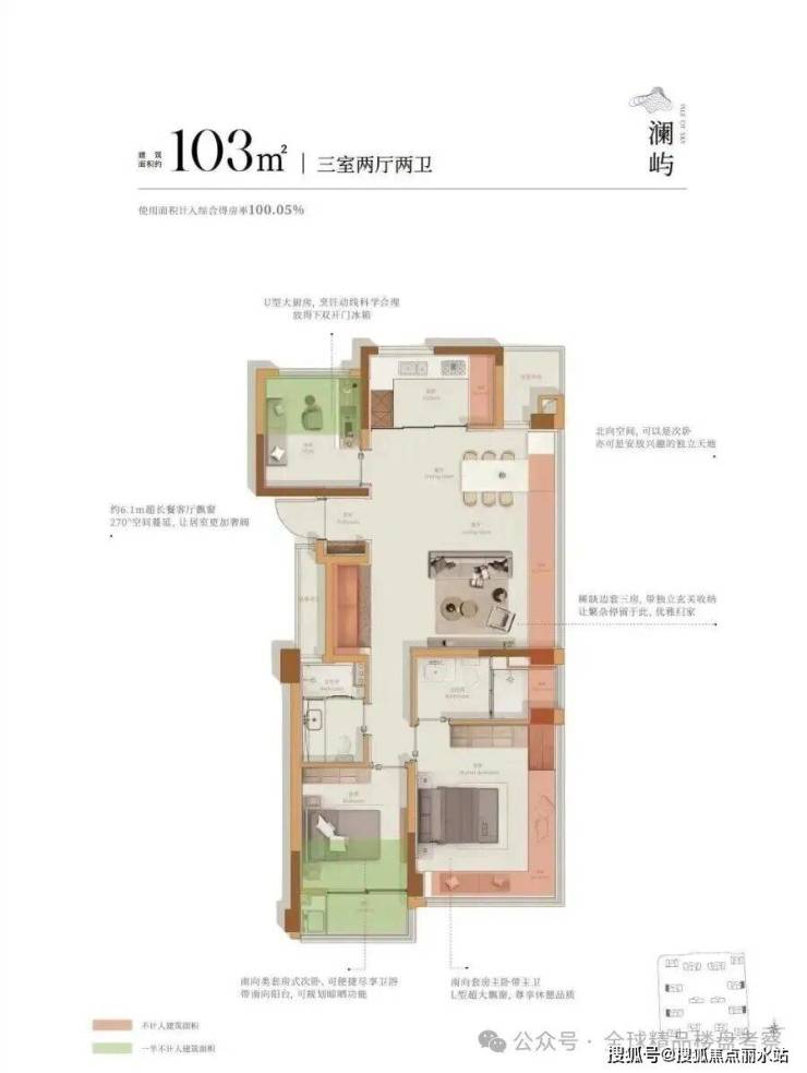 103㎡边套户型,厨房与客厅的飘窗经改造后,可变为操作台面或收纳柜,赠送面积超25.5㎡,空间利用率极高。