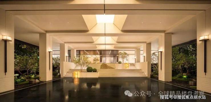 设计师在这里奢侈地造了一个宽约150米、纵深约36米的超级水院。奢石、叠水、层层绿植与雕塑高低错落,最特别的是,一道叠瀑直接从建筑立面上倾泻而下,仿佛建筑在与自然对话。