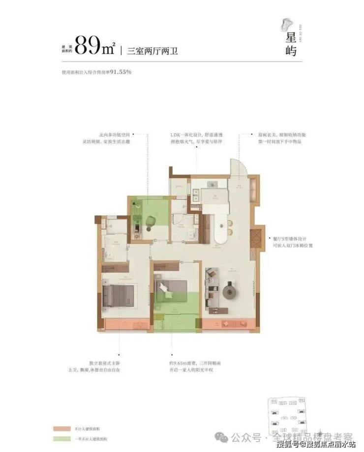沐芳洲全盘建筑面积约89㎡-132㎡,通过阳台面积延伸、巧妙设置飘窗等手法,部分户型实际得房率可达约100%。