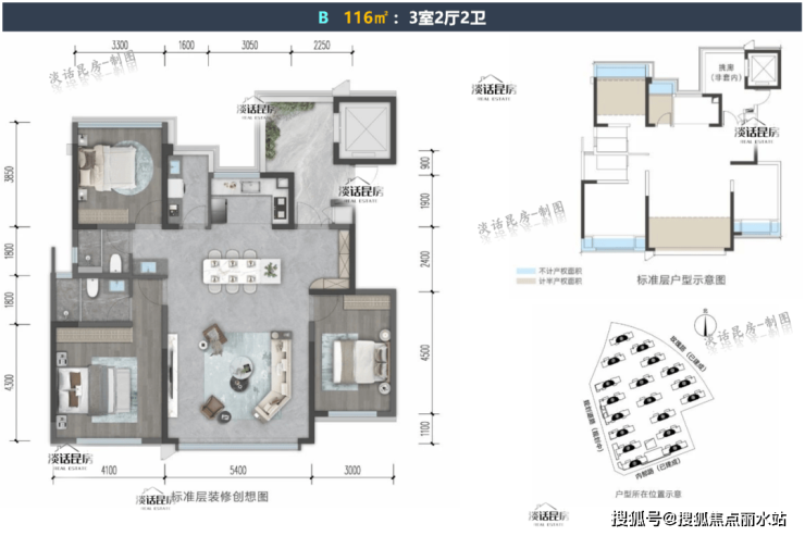 主打1T1户(双单元)低密小高层、约98~103%得房率(不含电梯前室)、及呈贡首个带