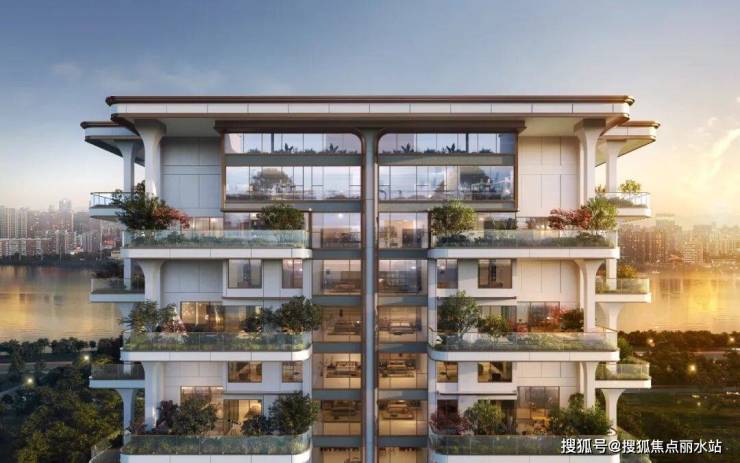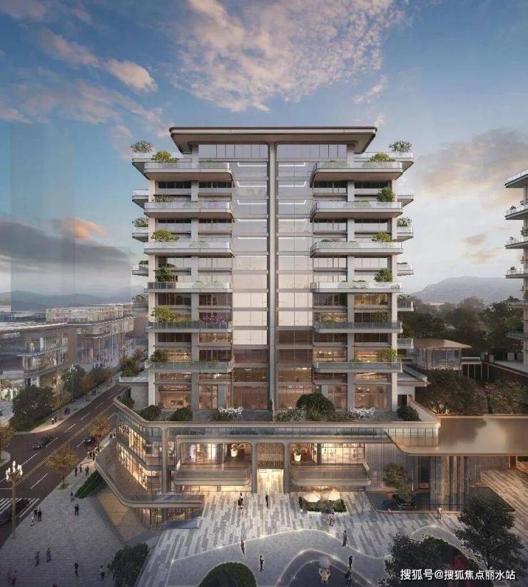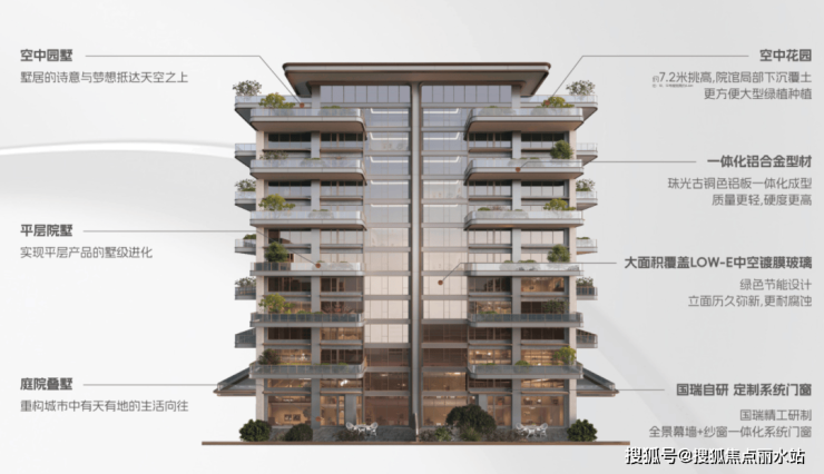 约40㎡空中花园局部下沉覆土,挑高约6.6米,方便种植乔木,辅以防水处理+防穿刺工艺;花园层叠错落,使立面造型颇具新意,焕新建筑美学。