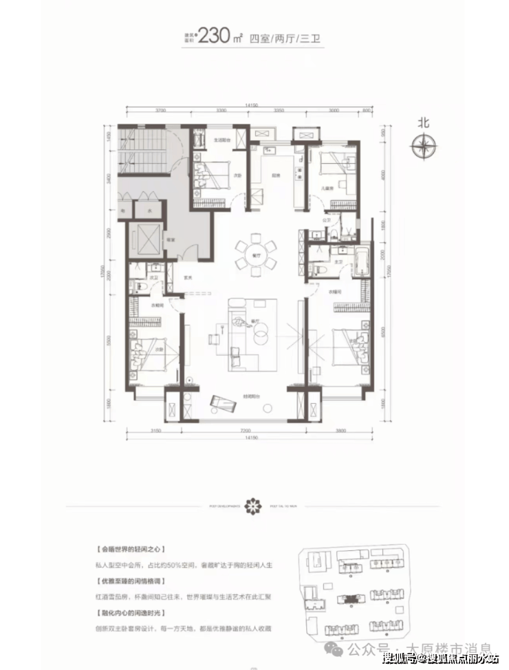 户型:230平米、235 平米两种,楼栋总高28层,公摊19.7%