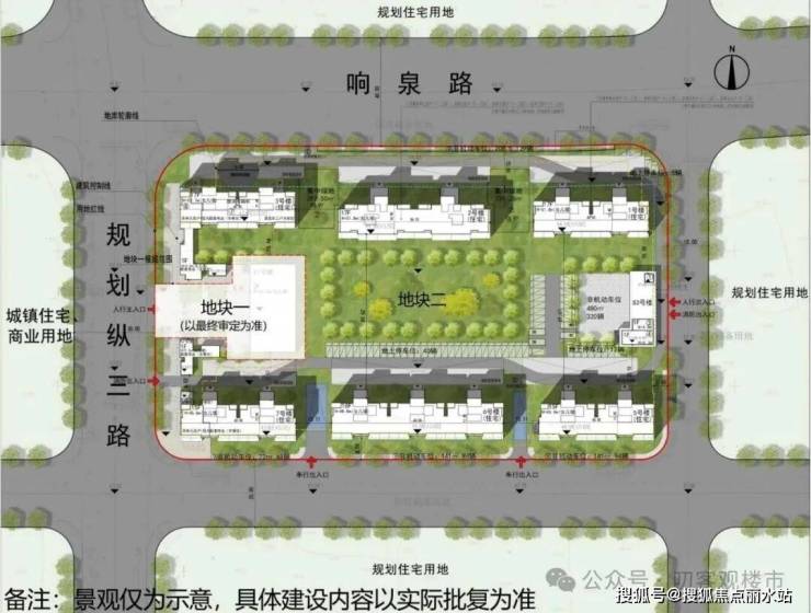 在商品住宅方面,共规划415套房源,户均113.8㎡。建筑形态方面,规划6栋15-17层中高层住宅。项目规划434个机动车停车位,其中地下车位配比为1:0.9。