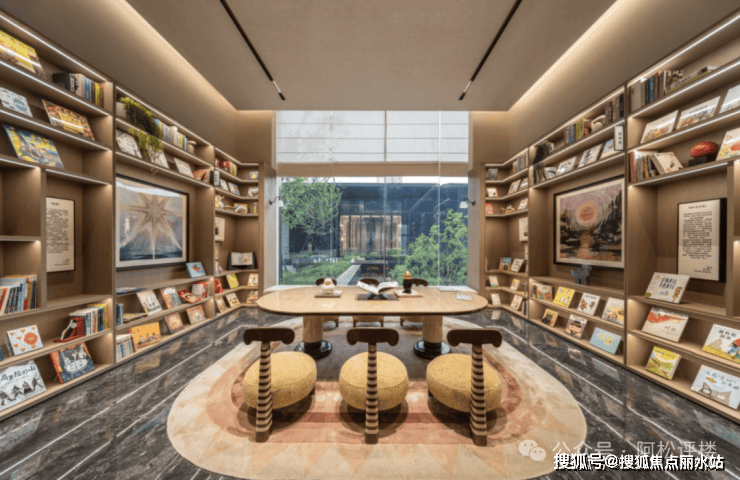 1号楼架空层,打造了约300平的满书屿,这里包含了儿童读书区、自习区、畅享区、共享会议等功能区域,做到了下楼即达艺术馆、图书馆、自习室的效果。
