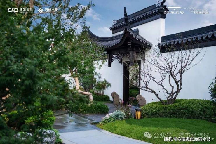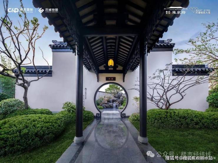 建发·雍泉府园区师法江南名园网师园,打造四进归家礼序,以恢弘雄伟的王府中式大门礼遇望族门风,配置九大景观节点,运用斗栱、椽子、回纹、浮雕等中式细节设计,特邀香山帮匠人手工打造,亭台楼阁、堆坡造景,营造步移景易的江南园林。