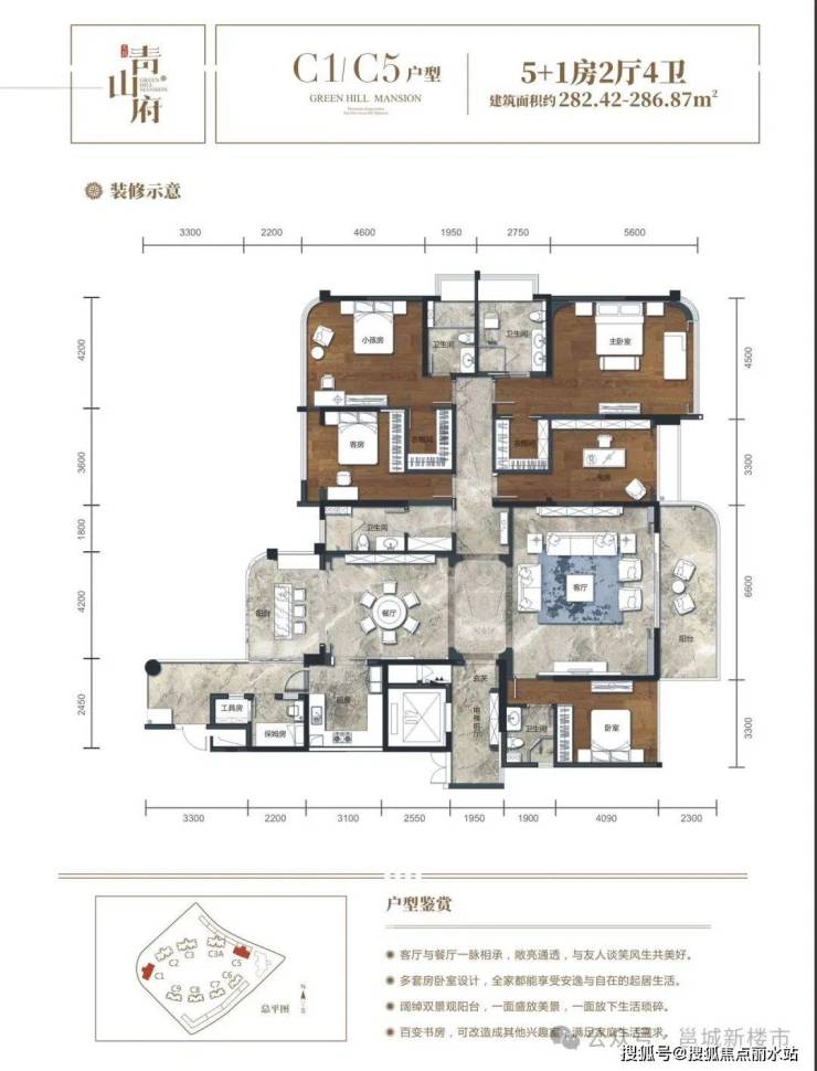 280㎡户型尺度升级,6+1房奢阔空间,76.6米大阳台,远眺青秀山美景,奢华主卧,270°环幕瞰景视野,青秀山美景尽收眼底。