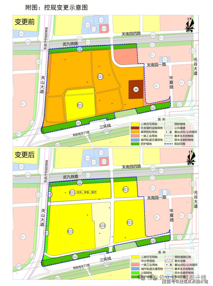 将该片区原控规的高等院校用地、社会福利设施用地、一类工业用地、部分防护绿地调整为二类住宅用地、中小学用地(小学36班、初中18班)、公园绿地和城市道路用地等;取消公共通道,新增2条红线宽度分别为25米和15米的东西向道路,以及1条南北向25米宽城市道路、关南园一路(软件园东路—规划一路)西侧用地预控5米红线;原规划的社会福利用地另行选址;新增复合控制文化设施不少于4000平、体育设施不少于8000平、医疗设施不少于3000平;取消关山大道东侧预控绿线。