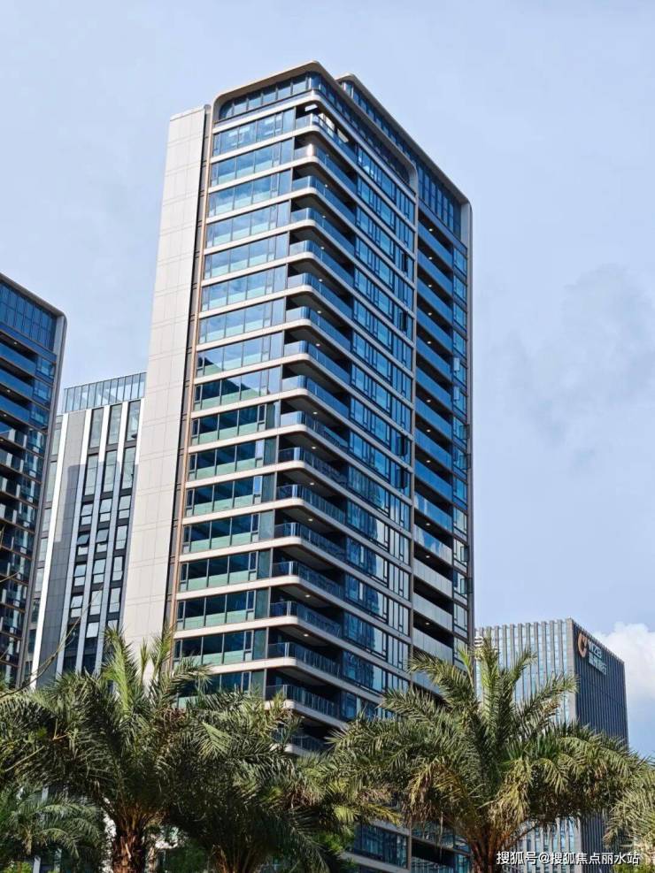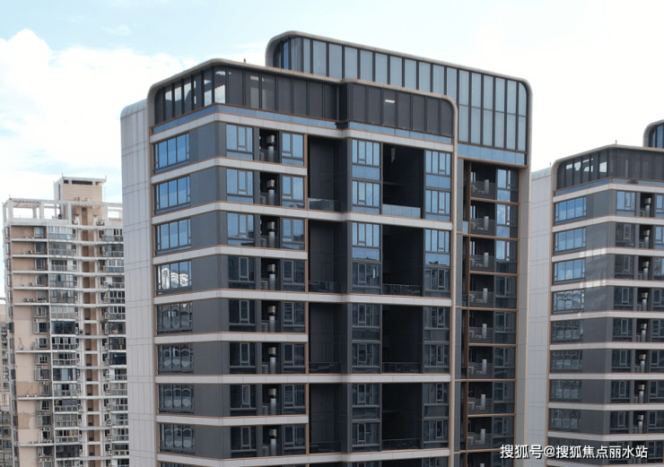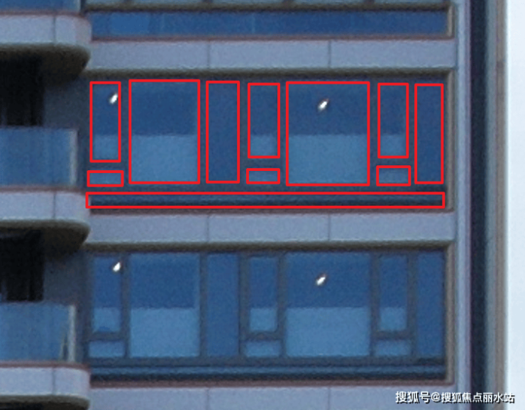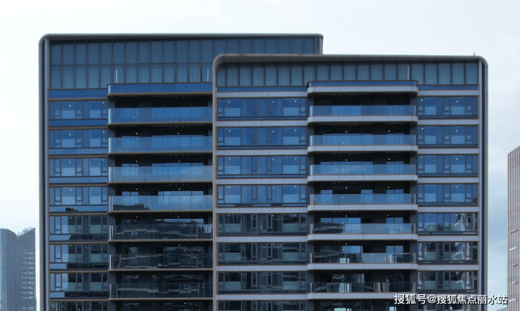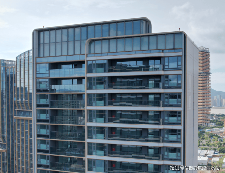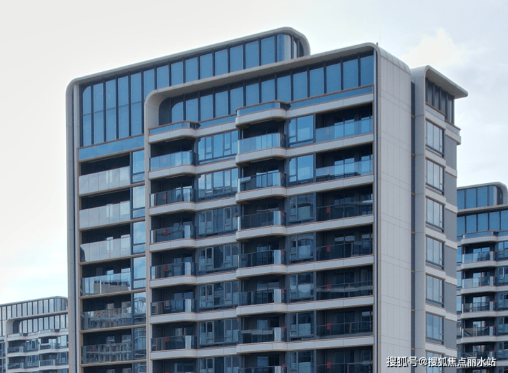 南向外立面主要以全落地玻璃幕墙为主,阳台使用转角弧形玻璃,南面的玻璃占比比较大。